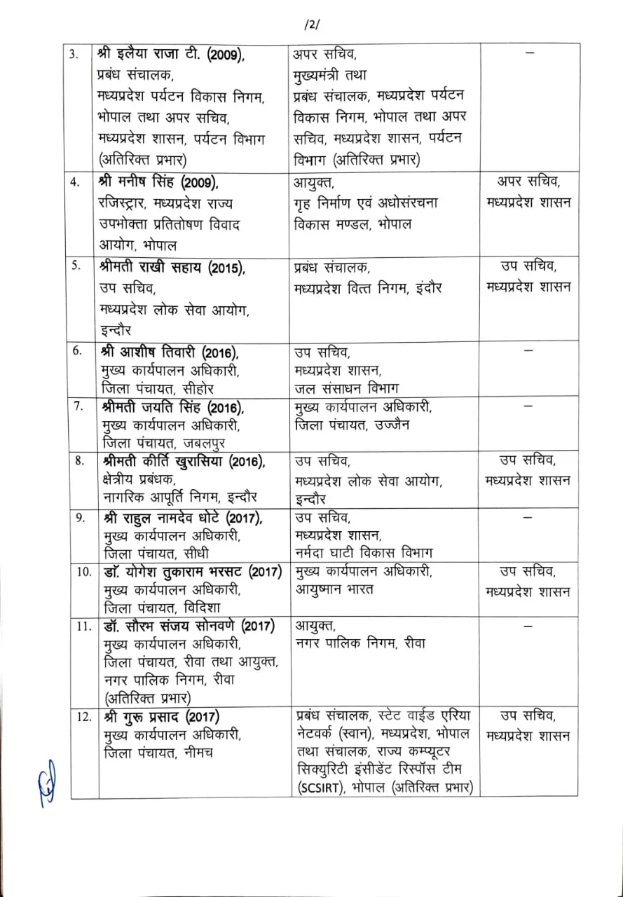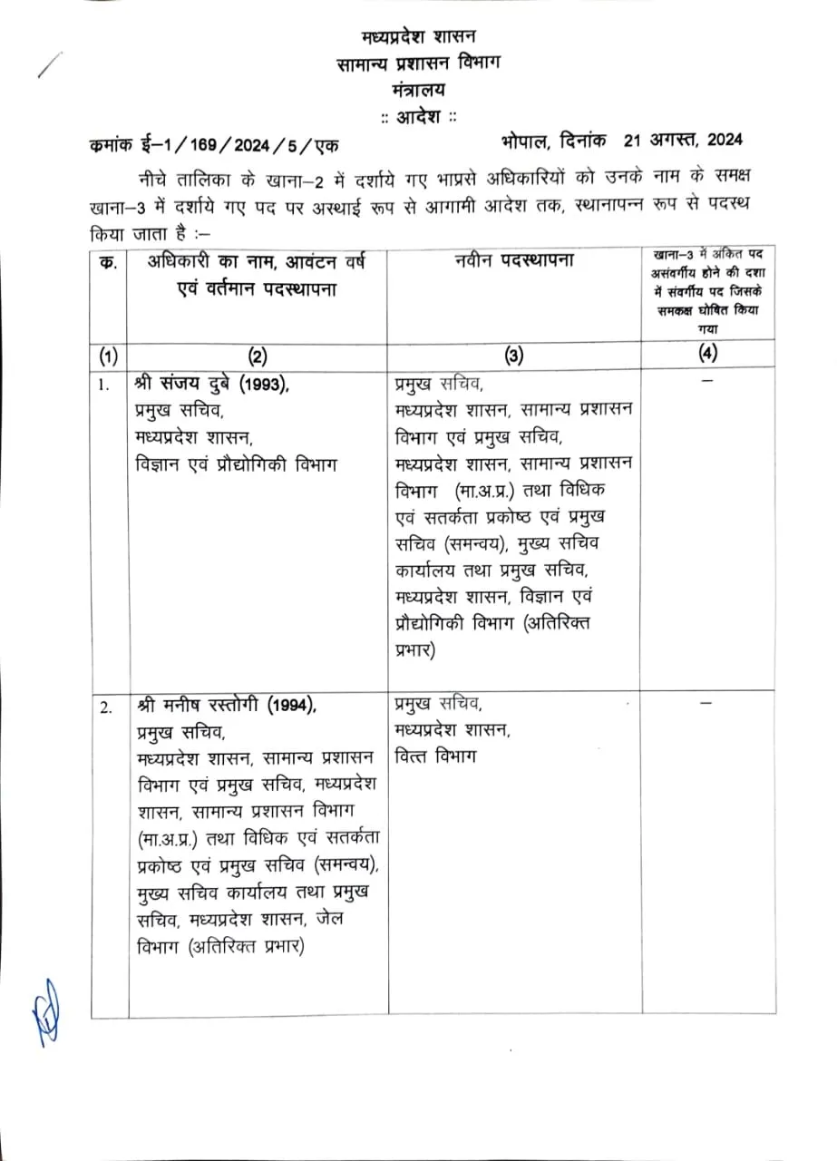 आईएएस संजय दुबे सामान्य प्रशासन विभाग के प्रमुख सचिव बनाए गए है। वहीं विज्ञान एवं प्रौद्योगिकी विभाग का अतिरिक्त प्रभार भी उन्हें दिया गया है। इसके अलावा मनीष रस्तोगी वित्त विभाग के प्रमुख सचिव बने है। इलैया राजा टी को अपर सचिव मुख्यमंत्री , MD पर्यटन विकास निगम का जिम्मा मिला है। वहीं मनीष सिंह को आयुक्त गृह निर्माण अधोसंरचना विकास मण्डल की जिम्मेदारी सौंपी गई है। IAS एसएन मिश्रा को जेल विभाग का भी अतिरिक्त प्रभार सौंपा गया है।