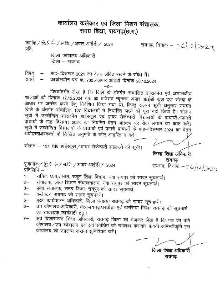 इस संबंध में रायगढ़ से एक मामला सामने आया है, जहां शिक्षा विभाग ने जिले के 107 स्कूलों के प्राचार्यों और प्रभारी प्राचार्यों के दिसंबर महीने के वेतन पर रोक लगा दी है। इन स्कूलों के प्राचार्य और प्रभारी प्राचार्य का वेतन बिना डीईओ के आदेश के जारी नहीं किया जाएगा।