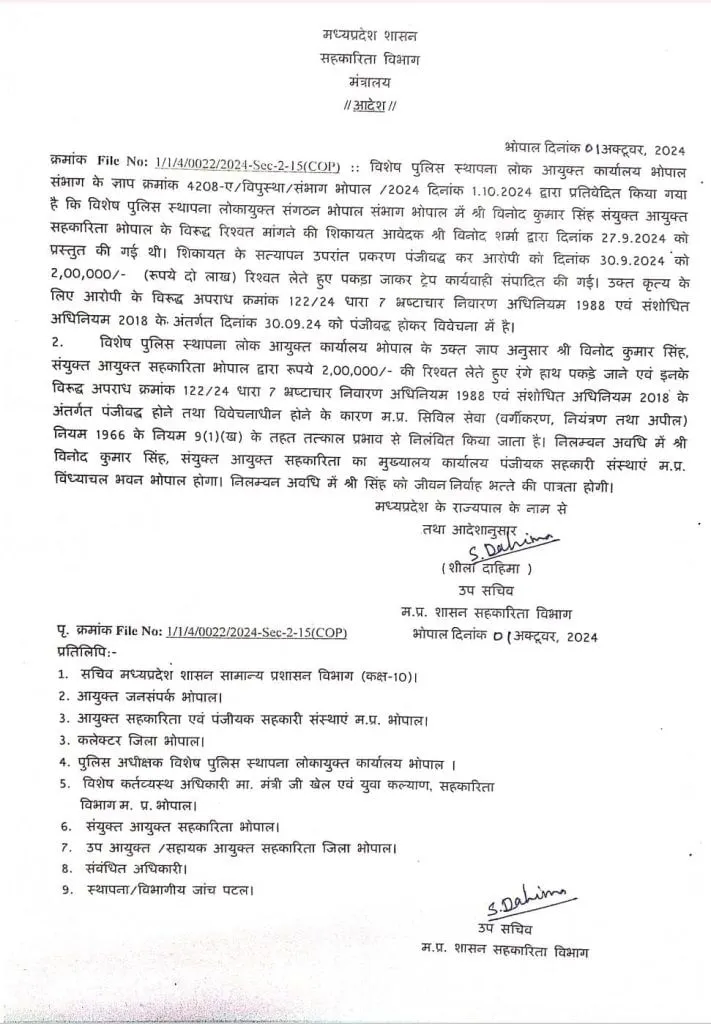 Bhopal News: सहकारिता विभाग के जॉइंट कमिश्नर विनोद सिंह के खिलाफ बड़ी कार्रवाई करते हुए भ्रष्ट अधिकारी को सस्पेंड कर दिया गया है। भोपाल लोकायुक्त पुलिस ने अधिकारी ने 2 लाख की रिश्वत लेते विनोद सिंह को रंगे हाथों पकड़ा था। विशाल सागर गृह निर्माण समिति को अनियमितता के संबंध में शिकायत के मामलें में क्लीन चिट देने के लिए सहकारिता विभाग के ज्वाइंट रजिस्ट्रार विनोद कुमार सिंह 5 लाख रिश्वत की मांग की थी।