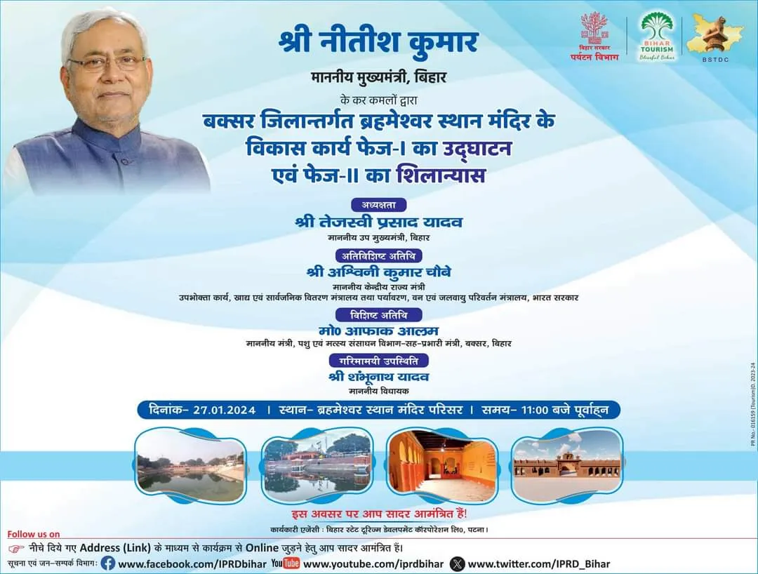 बक्सर के ब्रम्हेश्वर मंदिर निर्माण के फ्रेज 1 के उद्घाटन और फेज-2 का शिलान्यास कार्यक्रम में सीएम नीतीश कुमार और डिप्टी सीएम तेजस्वी यादव को शामिल होना है. नीतीश मुख्य अतिथि हैं, जबकि तेजस्वी अध्यक्षता करेंगे.