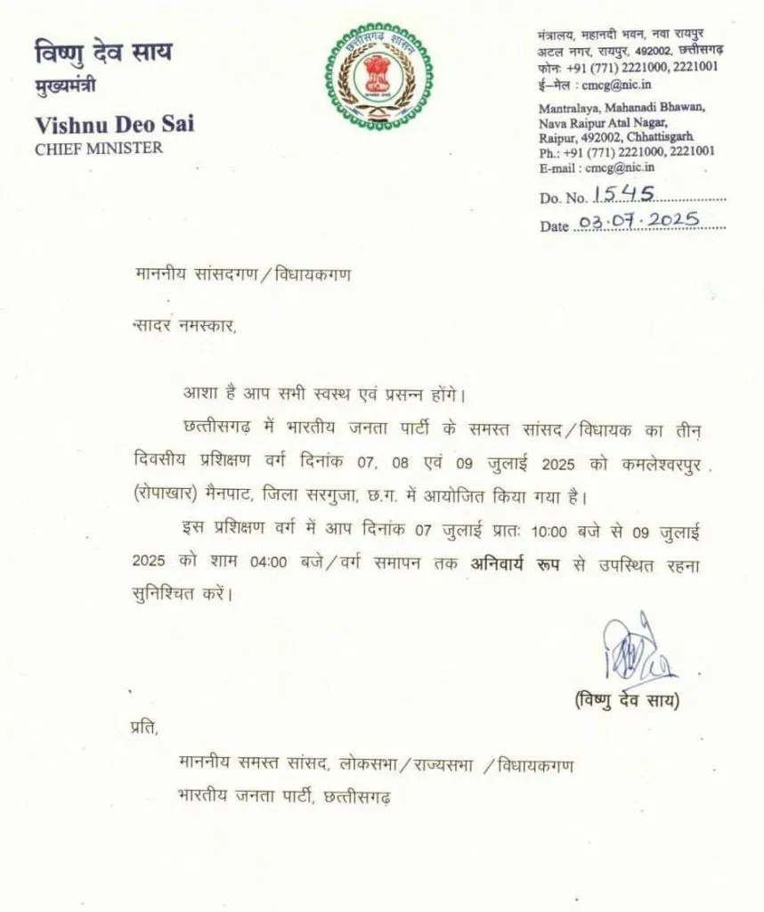मुख्यमंत्री विष्णु देव साय (Vishnu Dev Sai) ने भी पत्र लिखकर सभी को स्पष्ट संदेश दिया है कि यह प्रशिक्षण शिविर सिर्फ औपचारिकता नहीं है बल्कि भाजपा संगठन को और मजबूत करने का बड़ा अवसर है। इसलिए कोई भी इस शिविर को हल्के में न ले और तय समय पर अनिवार्य रूप से शामिल हो।