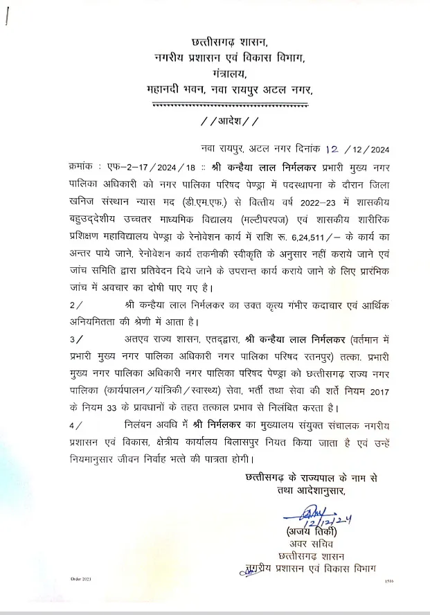 CG CMO Suspended: भ्रष्टाचार के मामलों में दो महत्वपूर्ण कार्रवाई की गई हैं। नगरीय प्रशासन विभाग ने दो सीएमओ (मुख्य नगरपालिका अधिकारी) को निलंबित कर दिया है। इनमें से एक, नगर पालिका पेंड्रा के तत्कालीन सीएमओ कन्हैया लाल निर्मलकर को स्कूलों के रेनोवेशन कार्य के लिए डीएमएफ (डिस्ट्रिक्ट मिनेरल फंड) से जारी राशि में गड़बड़ी करने का आरोपी पाया गया है।