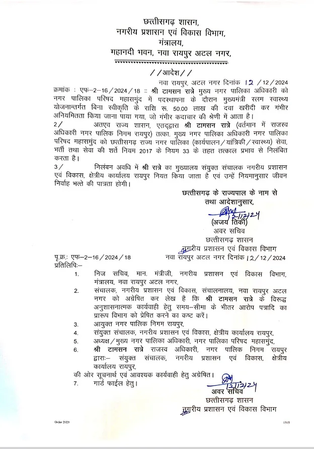 दूसरे मामले में महासमुंद के तत्कालीन सीएमओ टामसन रात्रे को भी निलंबित कर दिया गया है। उन पर भ्रष्टाचार का आरोप है, जिसमें बिना स्वीकृति के 50 लाख रुपये की दवाइयां खरीदने का आरोप लगाया गया है।