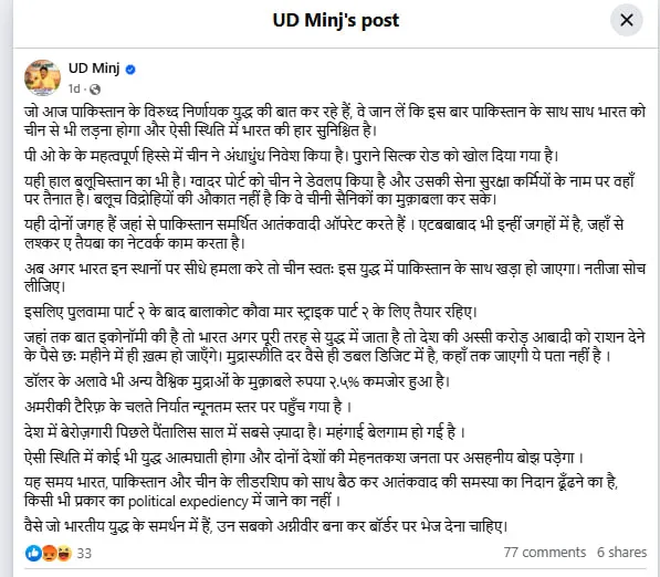 यूडी मिंज ने अपने पोस्ट में यह भी उल्लेख किया कि अगर भारत युद्ध करता है तो उसे न केवल पाकिस्तान से बल्कि चीन से भी लड़ना होगा। चीन ने पाकिस्तान के PoK और बलूचिस्तान में काफी निवेश किया है और वहां अपनी सैन्य तैनाती बढ़ा दी है। मिंज ने चेतावनी दी कि ऐसे में यदि भारत इन क्षेत्रों पर हमला करता है तो चीन स्वाभाविक रूप से पाकिस्तान का साथ देगा, जिससे युद्ध की स्थिति और भी जटिल हो जाएगी।