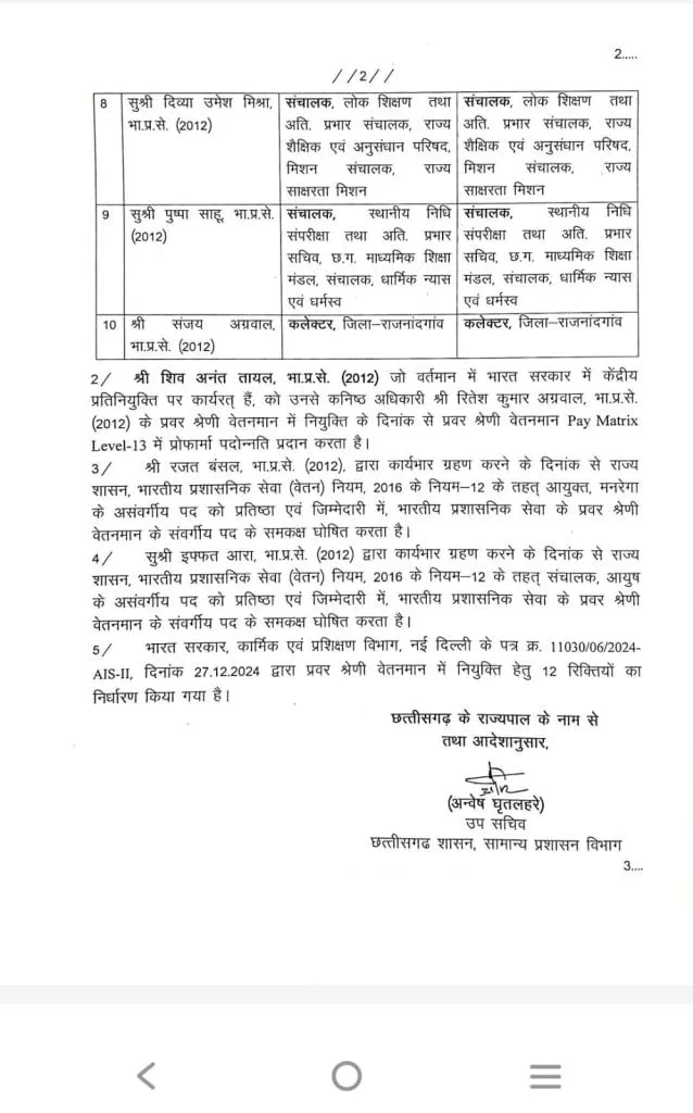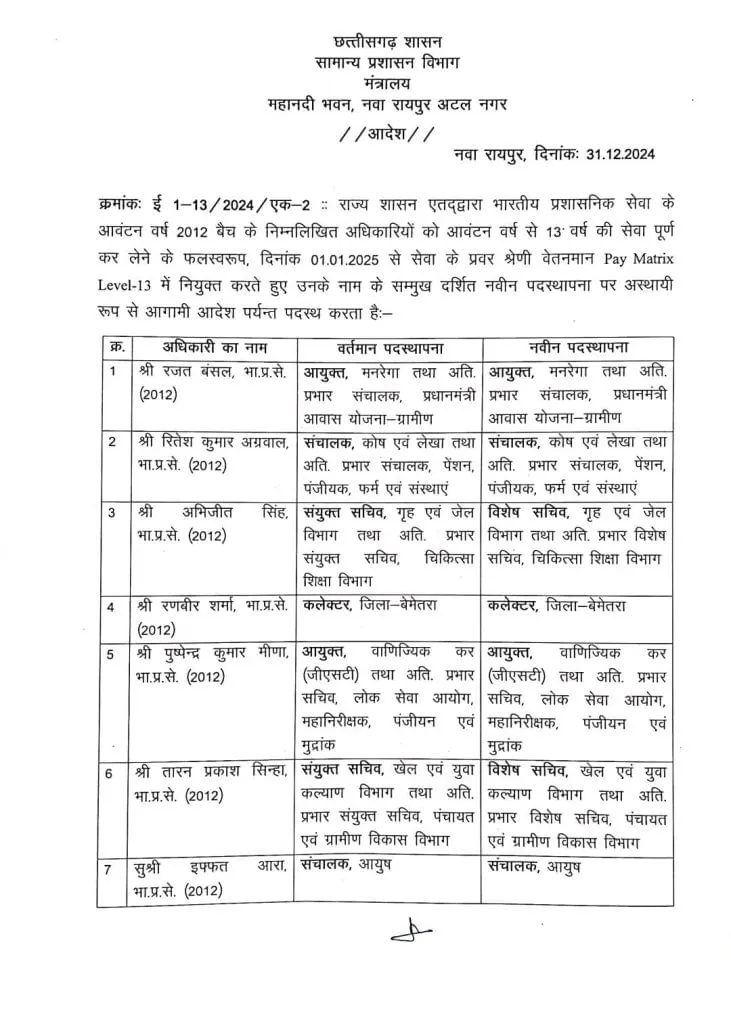 CG IAS Transfer: राज्य सरकार ने साल के आखिरी दिन बड़े पैमाने पर आईएएस अधिकारियों के प्रमोशन के आदेश जारी किए हैं। कुछ अधिकारियों को प्रमोशन के बाद नया प्रभार सौंपा गया है, जबकि अधिकांश अधिकारी अपनी वर्तमान पदस्थापना पर ही बने रहे हैं।