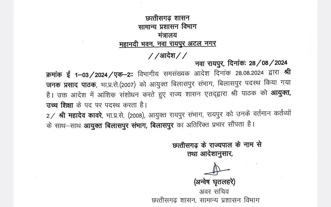 सरकार ने बुधवार रात करीब 8 बजे ट्रांसफर आदेश जारी किया, लेकिन रात 11 बजे उसमें एक महत्वपूर्ण संशोधन किया गया। पहले जनक प्रसाद पाठक को बिलासपुर संभाग का कमिश्नर बनाया था, लेकिन 3 घंटे बाद संशोधित आदेश जारी कर उन्हें उच्च शिक्षा विभाग का आयुक्त बनाया गया।