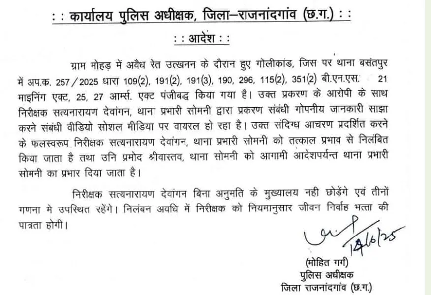 इस मामले में एक वीडियो सोशल मीडिया पर वायरल हुआ है, जिसमें सोमनी थाने के टीआई सत्यनारायण देवांगन (TI Satyanarayan Dewangan) की संदिग्ध भूमिका सामने आई। वीडियो में कथित तौर पर टीआई को घटना स्थल पर मौजूद दिखाया गया है लेकिन कार्रवाई नहीं करते हुए देखा गया। एसपी के निर्देश पर उन्हें तत्काल प्रभाव से निलंबित कर दिया गया है।