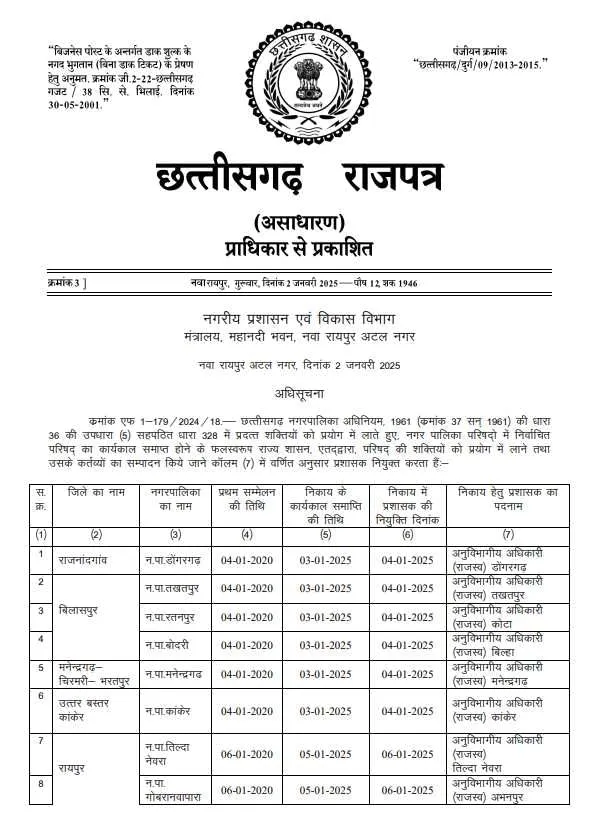 CG Local Body Election: राज्य सरकार ने प्रदेश की 47 नगर पालिकाओं में प्रशासकों की नियुक्ति को लेकर एक अधिसूचना राजपत्र में प्रकाशित की है। इन प्रशासकों के रूप में एसडीएम (सबसिडियरी डिप्टी मजिस्ट्रेट) को नियुक्त किया गया है।