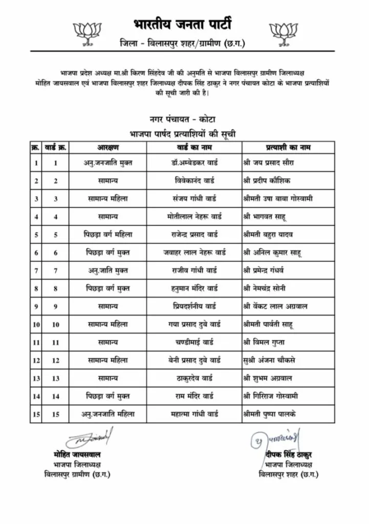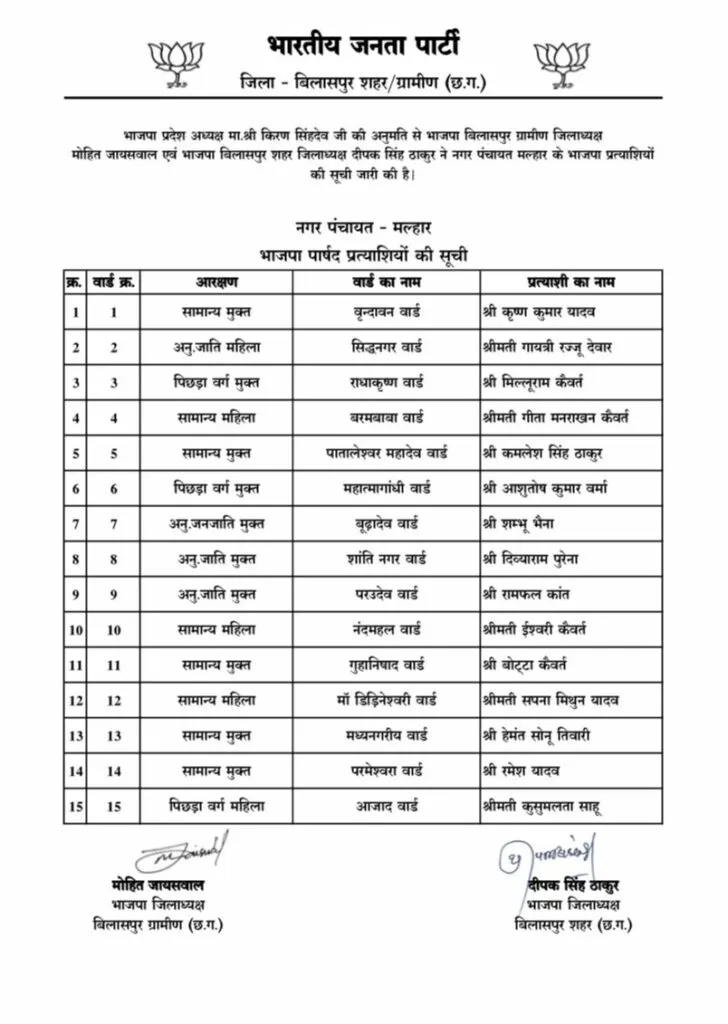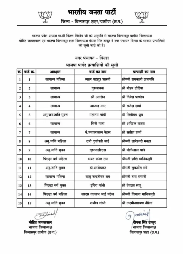 CG Nagariya Nikay Chunav: बिलासपुर: छत्तीसगढ़ भाजपा ने बिलासपुर जिले की तीन नगर पंचायतों, बिल्हा, कोटा और मल्हार के पार्षद पद के उम्मीदवारों की सूची जारी की है। इस सूची में कुल 45 पार्षद प्रत्याशियों के नाम शामिल किए गए हैं।