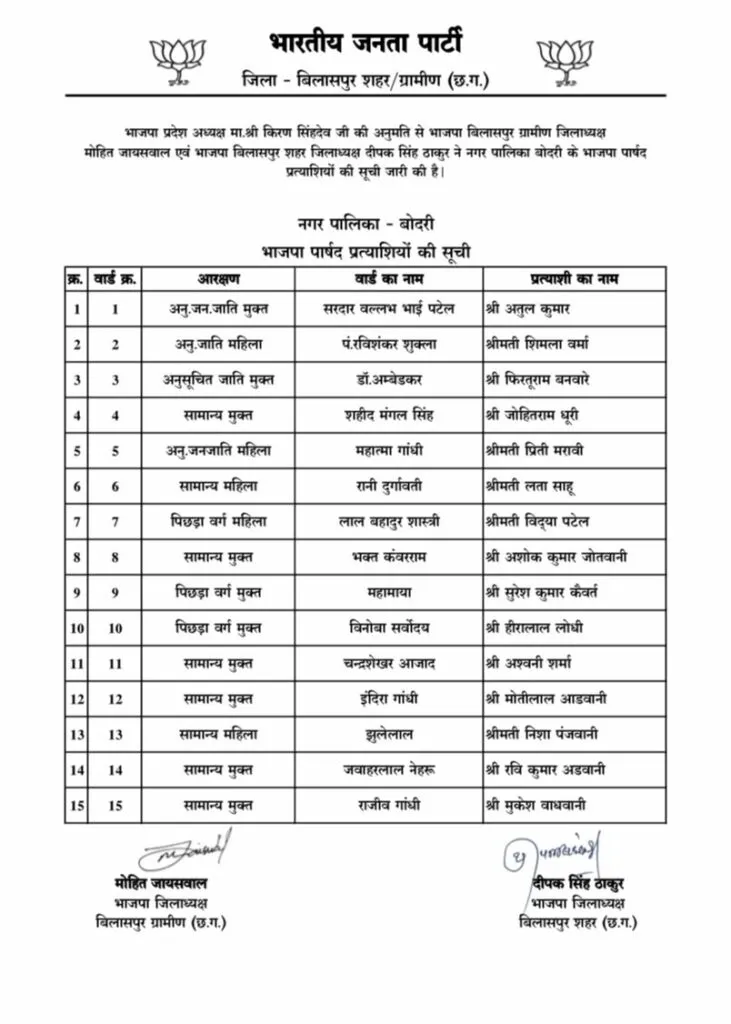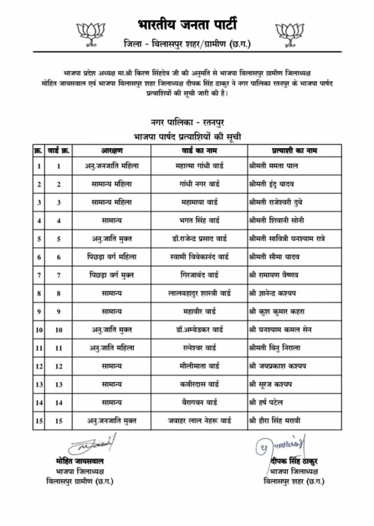 साथ ही, रतनपुर, बोदरी और तखतपुर नगरपालिकाओं में भी भाजपा ने अपने पार्षद प्रत्याशियों की सूची जारी की है। इन तीन नगरपालिकाओं के लिए भी 45 पार्षद उम्मीदवारों के नाम घोषित किए गए हैं।