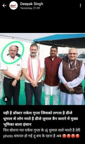 इस पोस्ट पर लिखा है कि “यही है डॉ. राकेश गुप्ता। जिसको लगता है डीजे-धूमाल से लोग मरते हैं। डीजे-धूमाल को बैन कराने में मुख्य भूमिका वाला इंसान। फिर मत बोलना राकेश गुप्ता के डीजे-धूमाल वाले मारते हैं। तेरी फोटो वायरल हो गई है तू बच के रहना अब…।