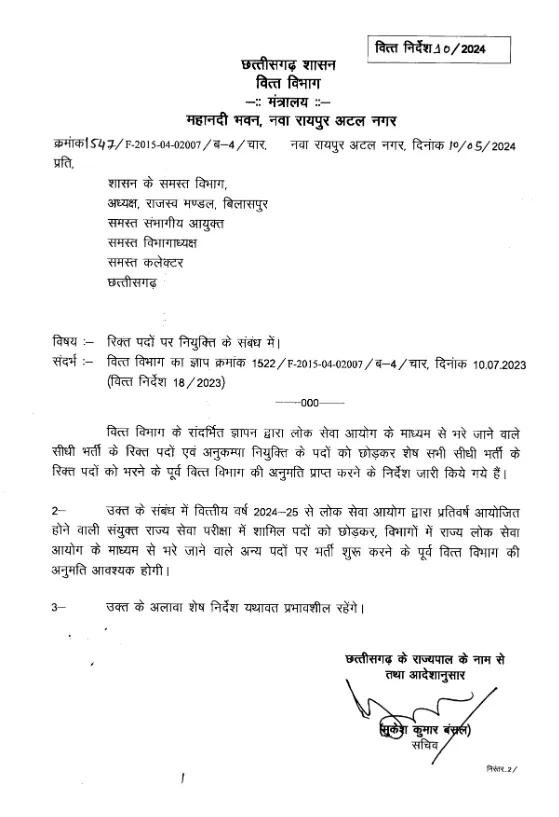 CG News: छत्तीसगढ़ में अब विभागीय प्रमुख सीधी भर्ती नहीं कर सकेंगे. वित्त विभाग की अनुमति के बिना नियुक्तियां नहीं हो सकेंगी. सरकार के अलग-अलग विभागों में होने वाली सीधी और संविदा के रिक्त पदों पर वित्त विभाग की अनुमति से नियुक्तयां की जाएंगी. हालांकि यह आदेश PSC की सीधी भर्ती और अनुकंपा नियुक्ति पर लागू नहीं होगा. वित्त विभाग ने इसको लेकर आदेश जारी कर दिया है. कलेक्टर, संभागायुक्त और विभागीय प्रमुखों को आदेश जारी कर दिए गए हैं. खबर अपडेट हो रही है...