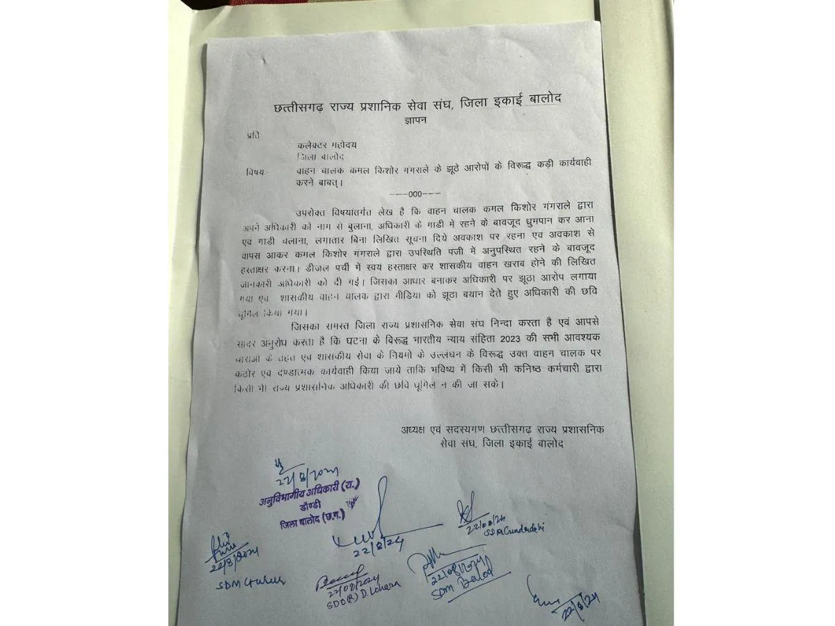 बालोद जिले (CG News) के ब्लॉक एसडीएम ने कलेक्टर को एक संयुक्त शिकायत पत्र सौंपा, जिसमें ड्राइवर कमल किशोर गंगराले की अनियमितताओं का उल्लेख किया गया है। शिकायत में कहा गया है कि ड्राइवर अपने वरिष्ठ अधिकारियों को सम्मानजनक संबोधन नहीं देता, बल्कि सीधे नाम लेकर पुकारता है।