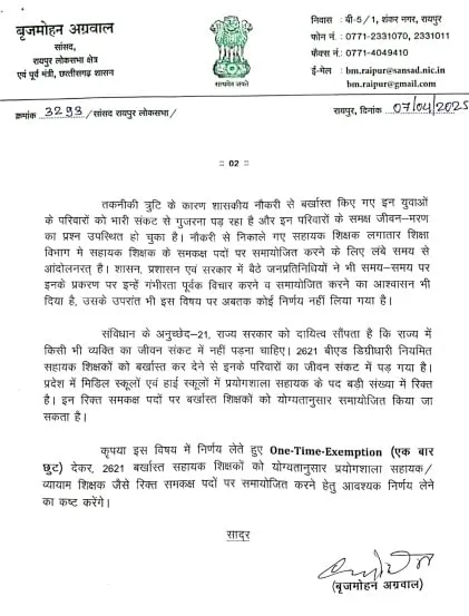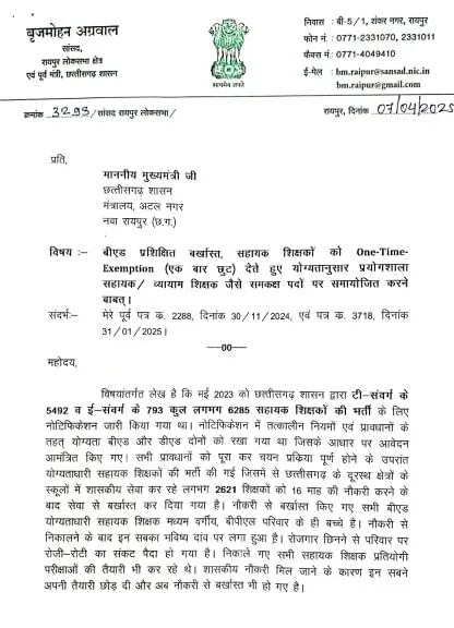 बृजमोहन अग्रवाल ने मुख्यमंत्री से आग्रह किया है कि इन बर्खास्त शिक्षकों को एक बार की विशेष छूट (Special Exemption) देकर प्रयोगशाला सहायक (Laboratory Assistant) या व्यायाम शिक्षक (Physical Education Teacher) जैसे समकक्ष पदों पर समायोजित किया जाए।