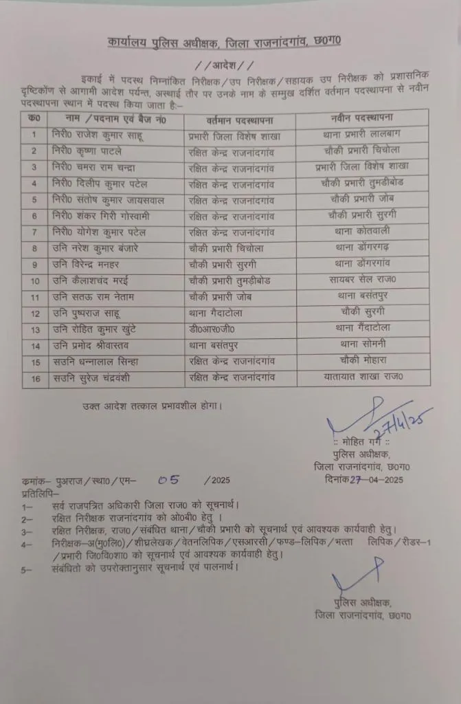 जारी आदेश के अनुसार 7 थाना प्रभारी (TI), 7 सब इंस्पेक्टर (SI) और 2 सहायक उप निरीक्षक (ASI) का तबादला किया गया है। यह तबादला प्रशासनिक कसावट और पुलिसिंग को मजबूत करने के उद्देश्य से किया गया है।