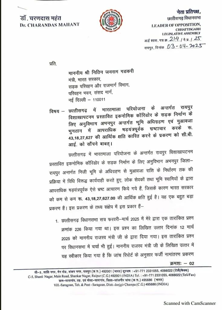 CG Bharatmala Project Scam: छत्तीसगढ़ में भारतमाला परियोजना को लेकर राजनीतिक भूचाल आया है। नेता प्रतिपक्ष डॉ. चरणदास महंत ने केंद्र सरकार पर गंभीर आरोप लगाते हुए केंद्रीय सड़क परिवहन और राजमार्ग मंत्री नितिन गडकरी को पत्र लिखा है।