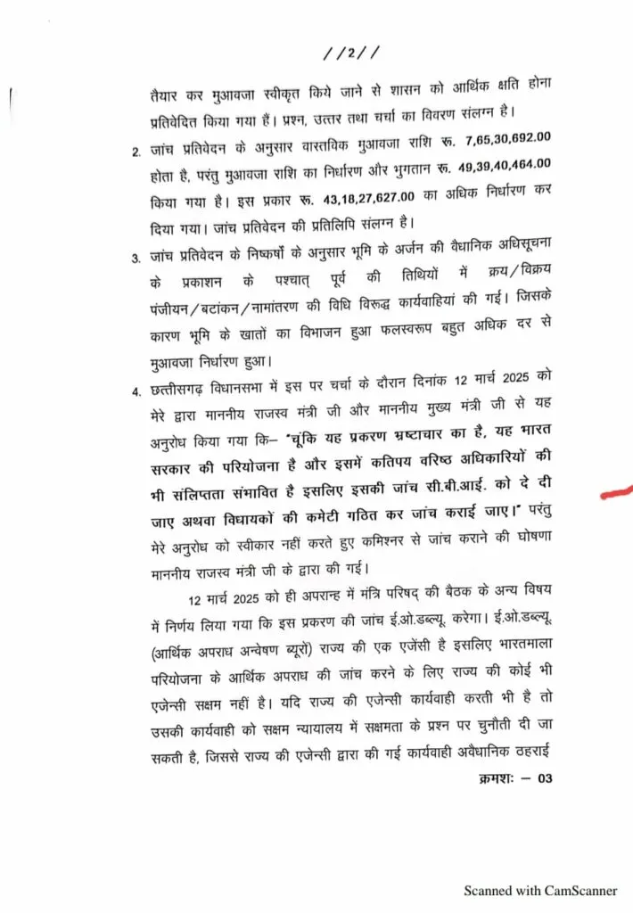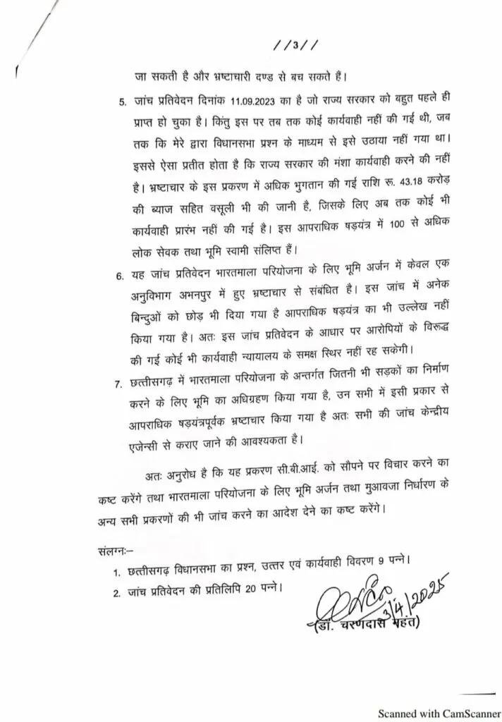 अपने पत्र में डॉ. महंत ने दावा किया है कि इस परियोजना के अंतर्गत भूमि अधिग्रहण में किसानों और जमीन मालिकों को दिए गए मुआवजे में भारी अनियमितता हुई है। उन्होंने इस पूरे मामले की निष्पक्ष जांच के लिए CBI से जांच कराने की मांग की है।