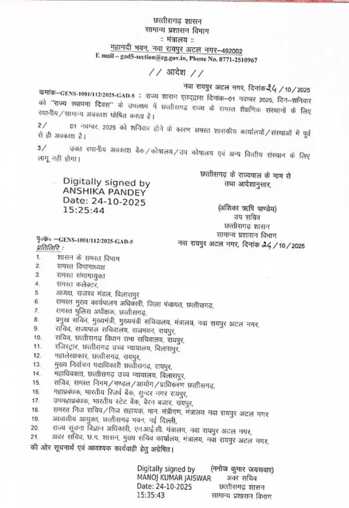 Chhattisgarh Foundation Day Holiday: छत्तीसगढ़ (Chhattisgarh) सरकार ने राज्य स्थापना दिवस (State Foundation Day) पर 1 नवंबर को सभी शैक्षणिक संस्थानों (Educational Institutions) में अवकाश घोषित किया है। सामान्य प्रशासन विभाग (GAD) ने आदेश जारी करते हुए शनिवार को स्थानीय / सामान्य अवकाश घोषित किया। राज्यभर के सरकारी, निजी स्कूल और कॉलेज इस दिन बंद रहेंगे।