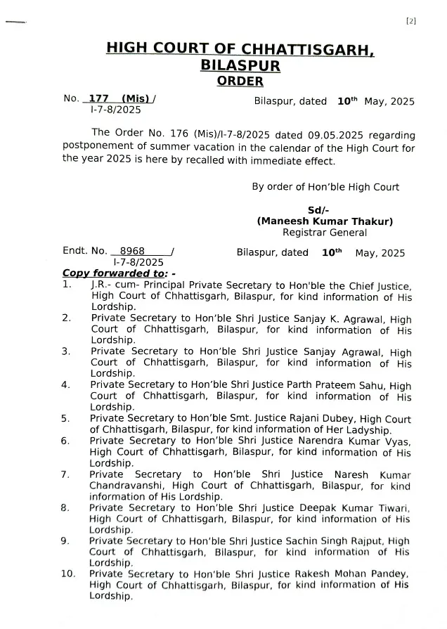 Chhattisgarh High Court: छत्तीसगढ़ के वकीलों और न्यायिक कर्मचारियों के लिए एक राहत भरी खबर सामने आई है। छत्तीसगढ़ उच्च न्यायालय (Chhattisgarh High Court) ने अपने 9 मई 2025 के आदेश क्रमांक 176 (विशेष)/1-7-8/2025 को वापस लेते हुए यह साफ कर दिया है कि अब ग्रीष्मकालीन अवकाश (Summer Vacation) पूर्व निर्धारित कैलेंडर के अनुसार ही रहेगा।