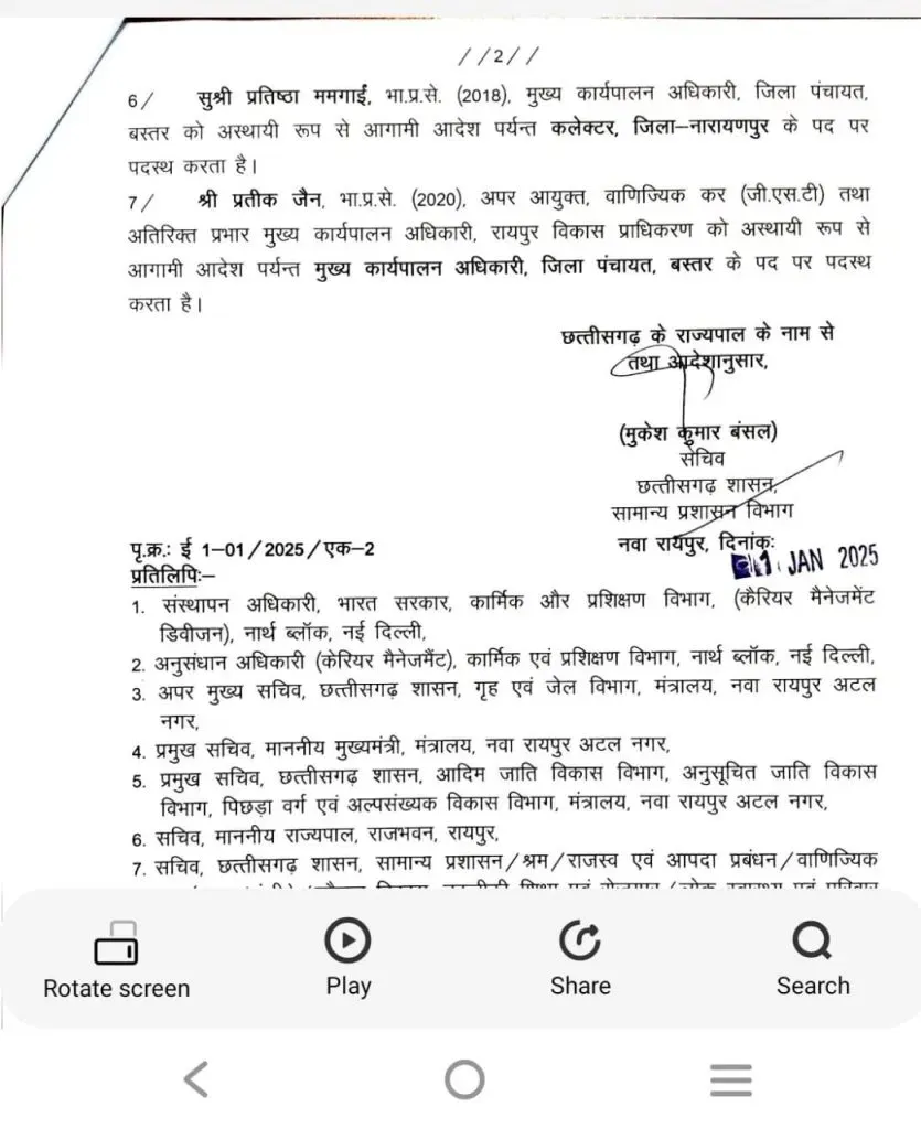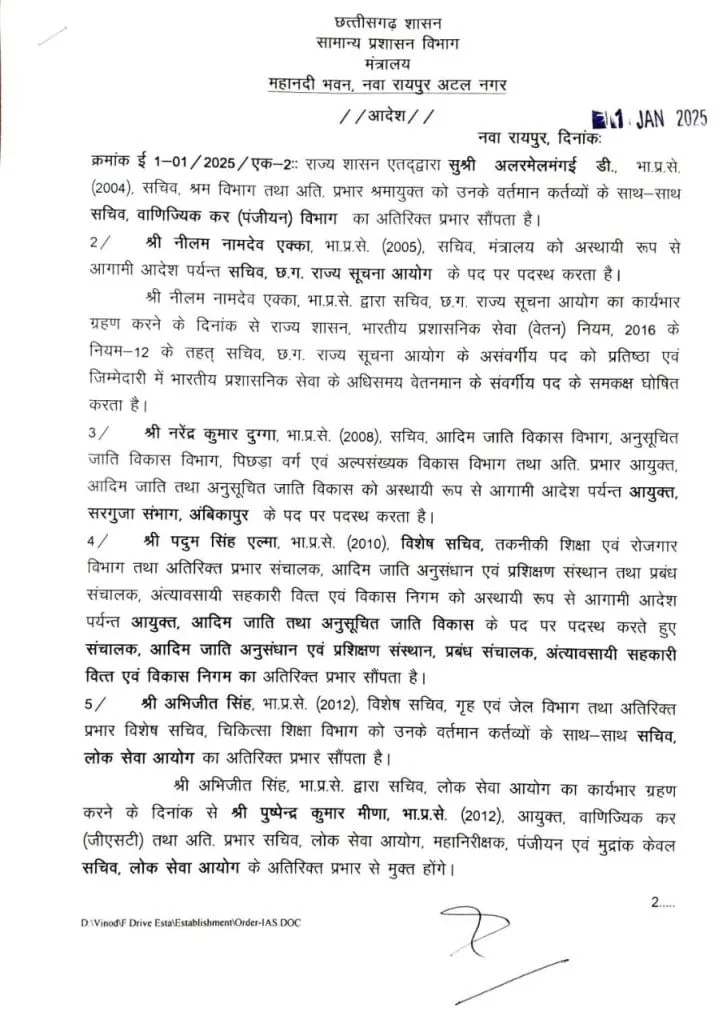 राज्य सरकार ने नए साल के पहले ही दिन 8 IAS अधिकारियों के तबादला आदेश जारी किए हैं। सामान्य प्रशासन विभाग द्वारा जारी आदेश के अनुसार, IAS नरेंद्र कुमार दुग्गा को सरगुजा कमिश्नर के पद पर नियुक्त किया गया है। वहीं, IAS प्रतिष्ठा ममगाई को नारायणपुर कलेक्टर की जिम्मेदारी सौंपी गई है।