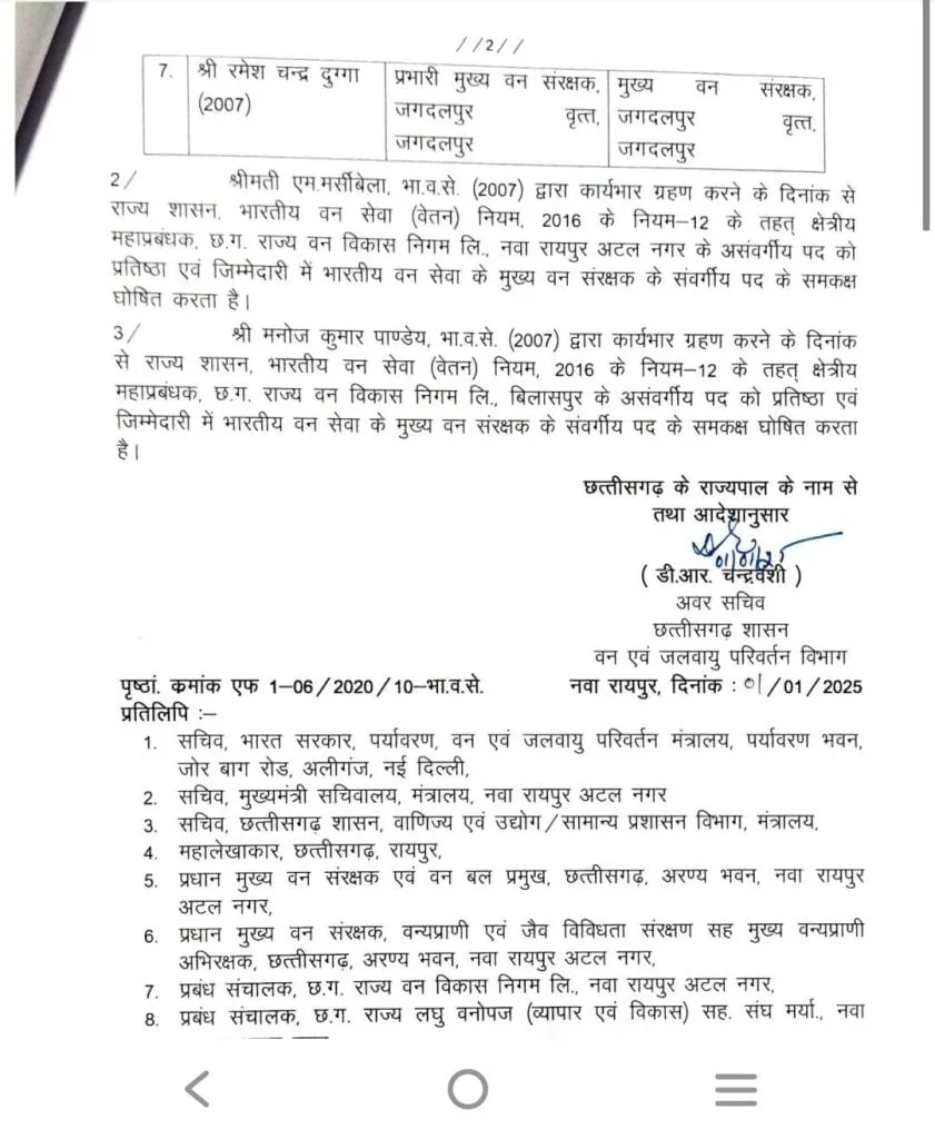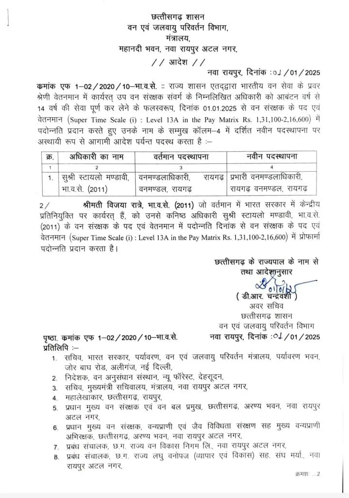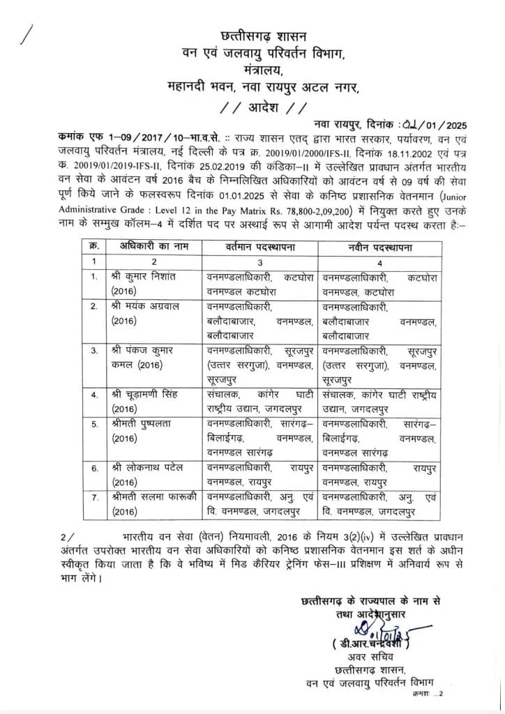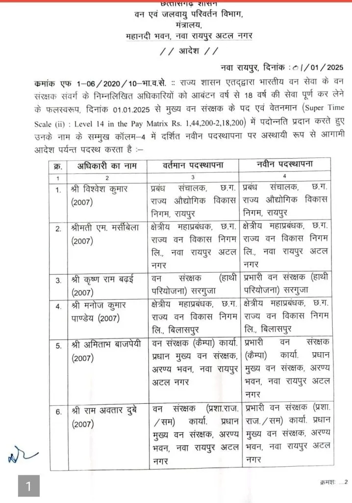 छत्तीसगढ़ में नए साल के पहले दिन, जहां IAS अधिकारियों के पदोन्नति के आदेश जारी किए गए, वहीं IFS अधिकारियों को भी पदोन्नति दी गई है। 2007, 2011, 2012 और 2016 बैच के 17 IFS अधिकारियों को प्रमोशन मिला है।