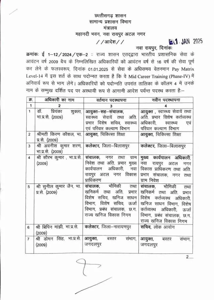 छत्तीसगढ़ सरकार ने 2009 बैच के 9 आईएएस अधिकारियों को पदोन्नति दी है। सामान्य प्रशासन विभाग द्वारा जारी आदेश के अनुसार, आईएएस डॉ. प्रियंका शुक्ला, आईएएस किरण कौशल, और आईएएस अवनीश कुमार शरण समेत कुल 9 आईएएस अधिकारियों को सचिव के पद पर नियुक्त किया गया है।