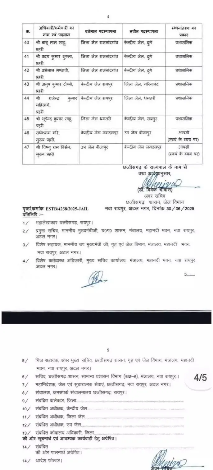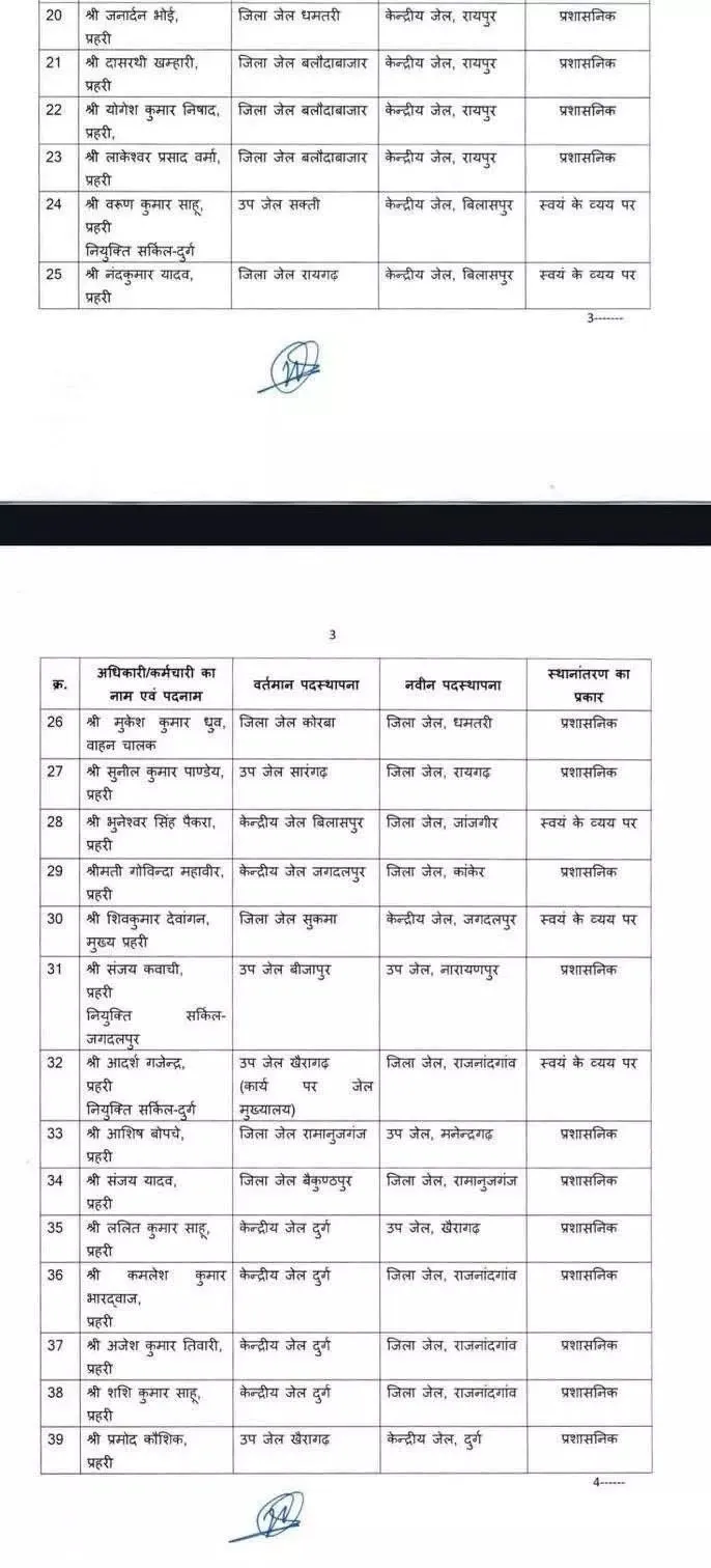 Chhattisgarh Transfer: छत्तीसगढ़ जेल प्रशासन विभाग ) ने एक अहम निर्णय लेते हुए केंद्रीय जेल रायपुर (Central Jail Raipur) समेत राज्य की विभिन्न उप जेलों (Sub Jails) में कार्यरत अधिकारियों और कर्मचारियों के तबादले का आदेश जारी किया है। तबादले की इस सूची में जेल अधीक्षक (Jail Superintendent), सहायक अधीक्षक (Assistant Superintendent) से लेकर प्रहरी (Guard) स्तर तक के कई अधिकारी-कर्मचारी शामिल हैं।
