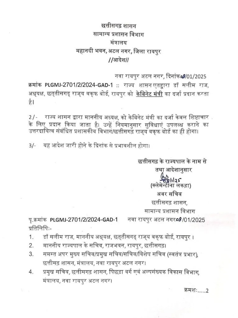 Cabinet Minister Dr Salim Raj: राज्य सरकार ने छत्तीसगढ़ राज्य वक्फ बोर्ड के अध्यक्ष डॉ. सलीम राज को कैबिनेट मंत्री का दर्जा प्रदान किया है। यह दर्जा केवल शिष्टाचार के तौर पर दिया गया है। सामान्य प्रशासन विभाग मंत्रालय द्वारा जारी आदेश के अनुसार, यह आदेश तत्काल प्रभाव से लागू हो गया है।
