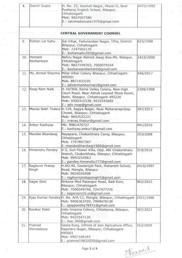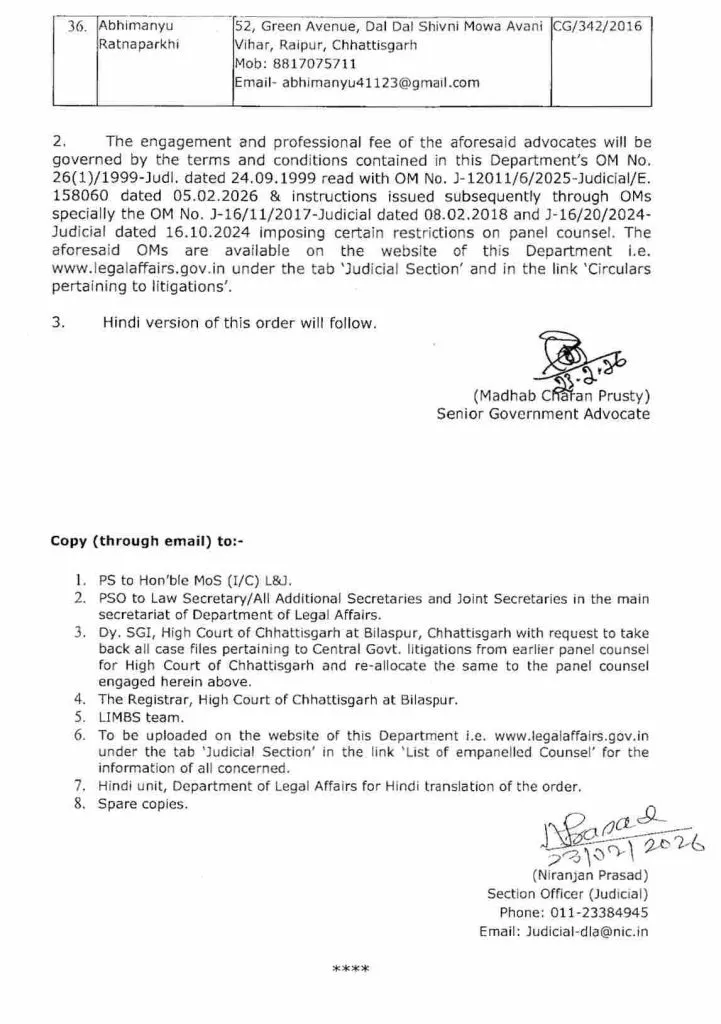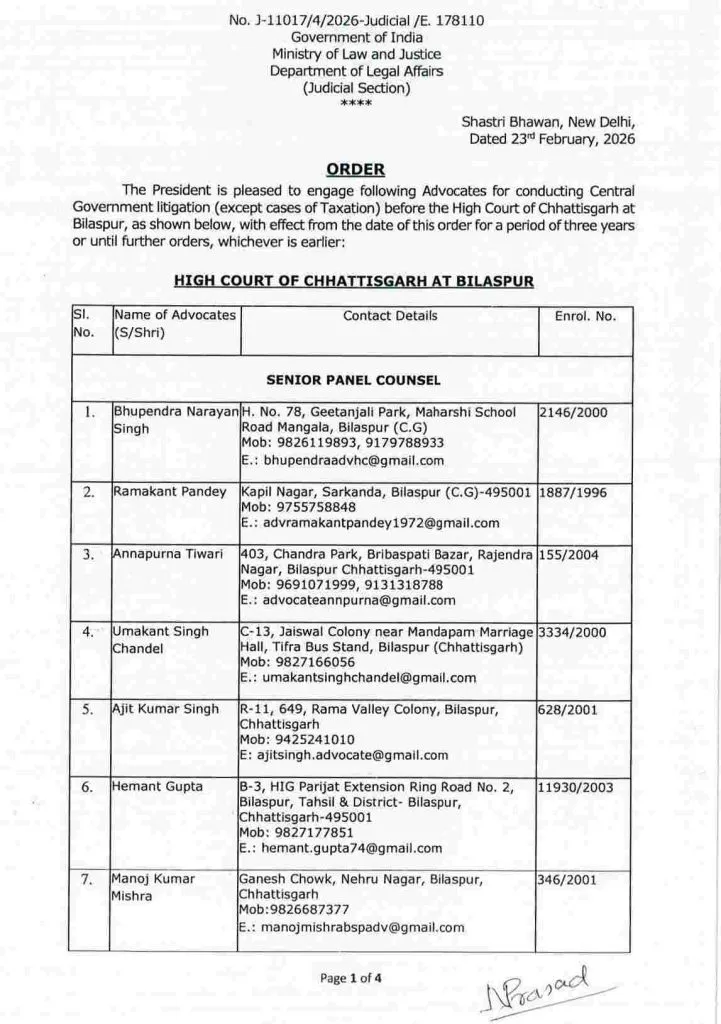 Chhattisgarh High Court: छत्तीसगढ़ हाईकोर्ट में केंद्र सरकार के मुकदमों की पैरवी के लिए 36 अधिवक्ताओं की सूची जारी की गई है। राष्ट्रपति की सहमति से 8 अधिवक्ताओं को सीनियर पैनल काउंसिल और 28 को सेंट्रल गवर्नमेंट काउंसिल नियुक्त किया गया है। केंद्रीय विधि एवं न्याय मंत्रालय ने तीन वर्षों के लिए यह आदेश जारी किया है।