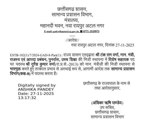 CG News: छत्तीसगढ़ सरकार ने राजस्व एवं आपदा प्रबंधन, पुनर्वास और उच्च शिक्षा मंत्री टंक राम वर्मा की निजी स्थापना में विशेष सहायक पद पर पदस्थ दुर्गेश कुमार वर्मा को तत्काल प्रभाव से भारमुक्त करते हुए सामान्य प्रशासन विभाग में भेज दिया है। आदेश 27 नवंबर को जारी किया गया।