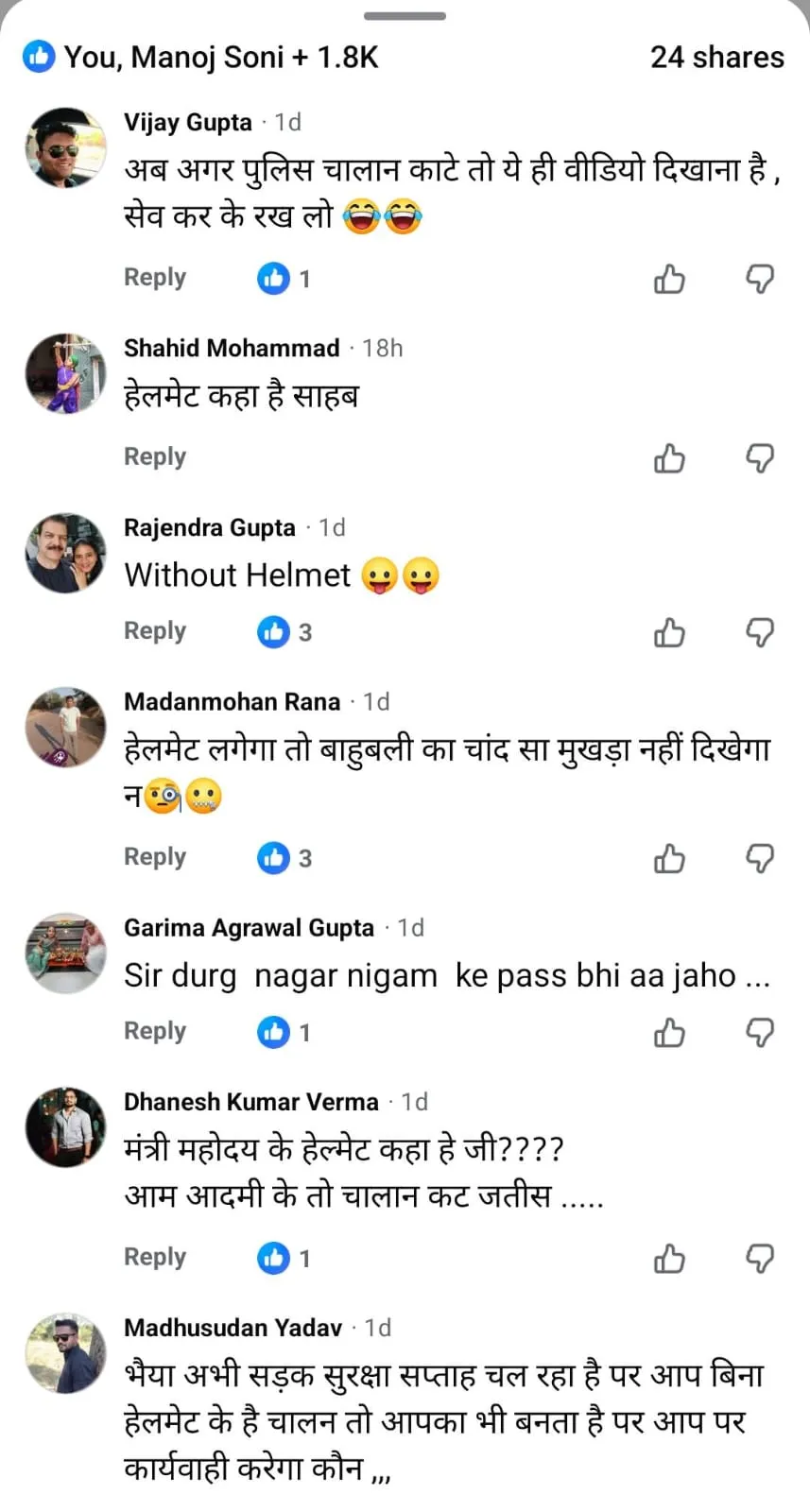 सोशल मीडिया यूजर्स का कहना है कि जब आम नागरिकों के चालान तुरंत काटे जाते हैं, तो जनप्रतिनिधियों के मामले में नियम क्यों ढीले पड़ जाते हैं। कई लोगों ने तंज कसते हुए लिखा कि, “हेलमेट लगेगा तो बाहुबली का चांद सा मुखड़ा नहीं दिखेगा।” कुछ यूजर्स ने सीधे सवाल किया कि क्या ट्रैफिक नियम सिर्फ आम जनता के लिए हैं, या नेताओं पर भी समान रूप से लागू होते हैं।