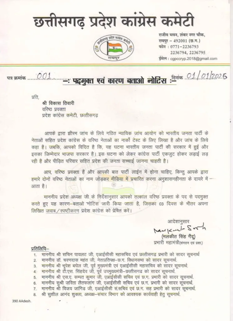 इस पूरे मामले में प्रदेश कांग्रेस अध्यक्ष दीपक बैज के निर्देश पर कार्रवाई की गई है। पार्टी ने विकास तिवारी को वरिष्ठ प्रवक्ता पद से हटाने के साथ-साथ तीन दिन के भीतर लिखित स्पष्टीकरण देने का नोटिस भी जारी किया है।