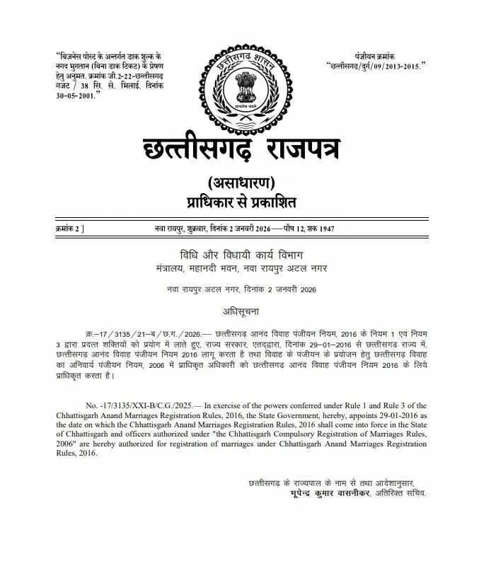 जारी अधिसूचना के अनुसार यह नियम उन सभी दंपतियों पर लागू होगा, जिनका विवाह 29 जनवरी 2016 या उसके बाद संपन्न हुआ है। सरकार ने ‘छत्तीसगढ़ आनंद विवाह पंजीयन नियम, 2016’ के तहत मिली शक्तियों का उपयोग करते हुए यह स्पष्ट किया है कि अब विवाह का पंजीकरण कराना केवल औपचारिकता नहीं, बल्कि कानूनी जरूरत होगी।