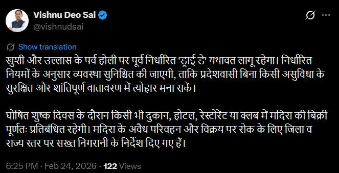 मुख्यमंत्री विष्णुदेव साय (Vishnu Deo Sai) ने सोशल मीडिया प्लेटफॉर्म एक्स (X Platform) पर जानकारी साझा करते हुए कहा कि खुशी और उल्लास के पर्व होली पर पूर्व निर्धारित ड्राई डे व्यवस्था पहले की तरह लागू रहेगी।