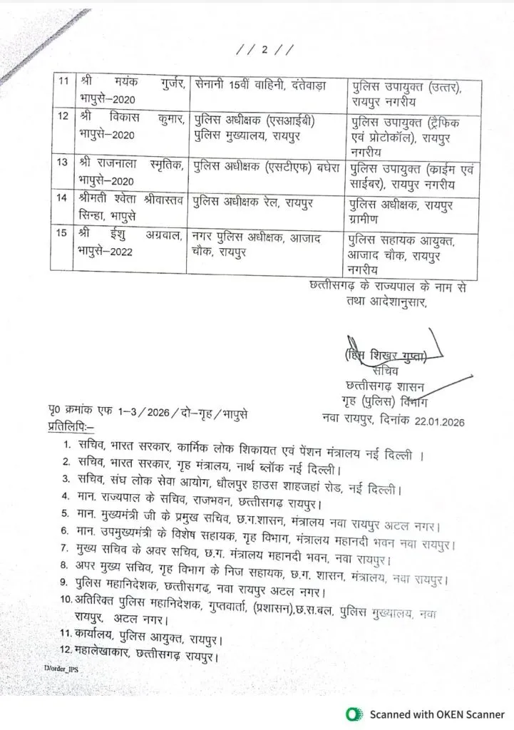 श्वेता श्रीवास्तव सिन्हा को पुलिस अधीक्षक, रेल रायपुर से हटाकर पुलिस अधीक्षक, रायपुर ग्रामीण बनाया गया है। वहीं 2022 बैच की IPS अधिकारी इंदु अग्रवाल को नगर पुलिस अधीक्षक, आजाद चौक से पुलिस सहायक आयुक्त, आजाद चौक, रायपुर नगरीय पदस्थ किया गया है।