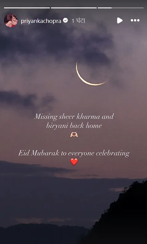 देसी गर्ल प्रियंका चोपड़ा ने भी ईद की बधाई दी है। आज ईद के दिन वो इंडिया में शीर खुर्मा और बिरयानी को मिस कर रही हैं। इसके अलावा शाहिद कपूर ने भी अपनी इंस्टाग्राम स्टोरी पर ईद की बधाई देते हुए पोस्ट साझा की है। साथ ही मशहूर फिल्म निर्माता करण जौहर, अभिनेता अर्जुन कपूर, अनिल कपूर, शिल्पा शेट्टी ने भी ईद पर मुबारकबाद दी है।