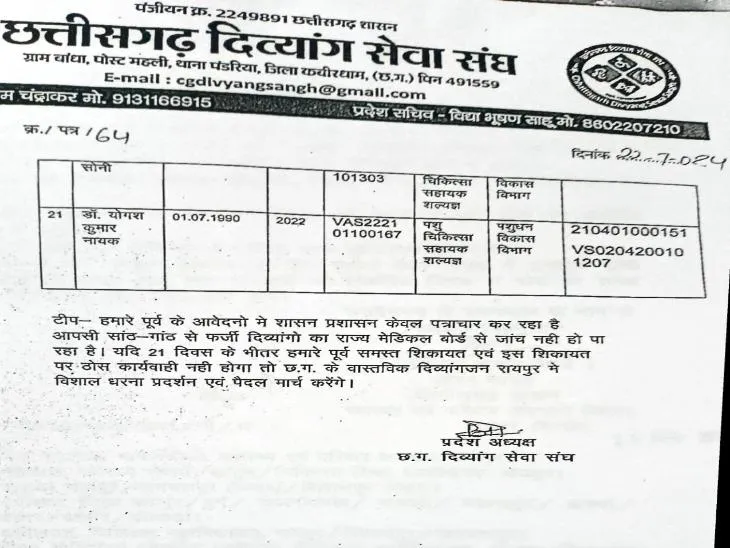 Fake Disability Certificate: छत्तीसगढ़ में भी ट्रेनी IAS पूजा खेडकर जैसा मामला सामने आया है. छत्तीसगढ़ दिव्यांग सेवा संघ ने बुधवार को प्रेस कॉन्फ्रेंस कर आरोप लगाया है कि प्रदेश में फर्जी दिव्यांगता सर्टिफिकेट बनाकर 21 लोग नौकरी कर रहे हैं.