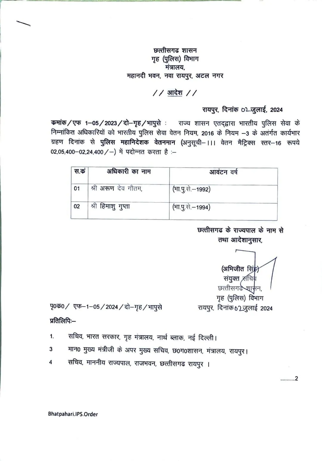 IPS Transfer in CG: छत्तीसगढ़ सरकार ने 2 सीनियर आईपीएस अधिकारियों को डीजी बनाया है. आईपीएस अधिकारी अरुणदेव गौतम और हिंमांशु गुप्ता को डीजी बनाया गया है. अरूणदेव 1992 बैच और हिमांशु 1994 बैच के अधिकारी हैं. गृह विभाग ने इसे लेकर मंगलवार को आदेश भी जारी कर दिया है.