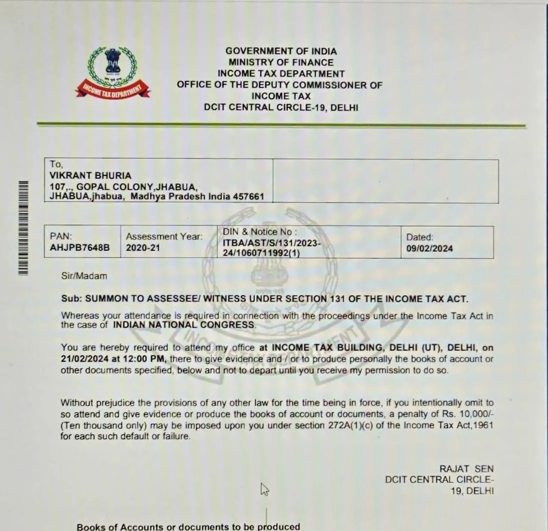 आपको बता दें, कि झाबुआ से विधायक डॉ. विक्रांत भूरिया और साल 2019 में भिंड से लोकसभा चुनाव लड़े देवाशीष जरारिया ने समन मिलने की पुष्टि की है। हालांकि, इन नेताओं का कहना है, कि उन्हें अभी यह पता नहीं है, कि समन भेजा क्यों गया है। इन्हें आयकर अधिनियम की धारा 131 के अंतर्गत नोटिस भेजा गया है, जिसमें साक्ष्य पेश करने का नियम है।