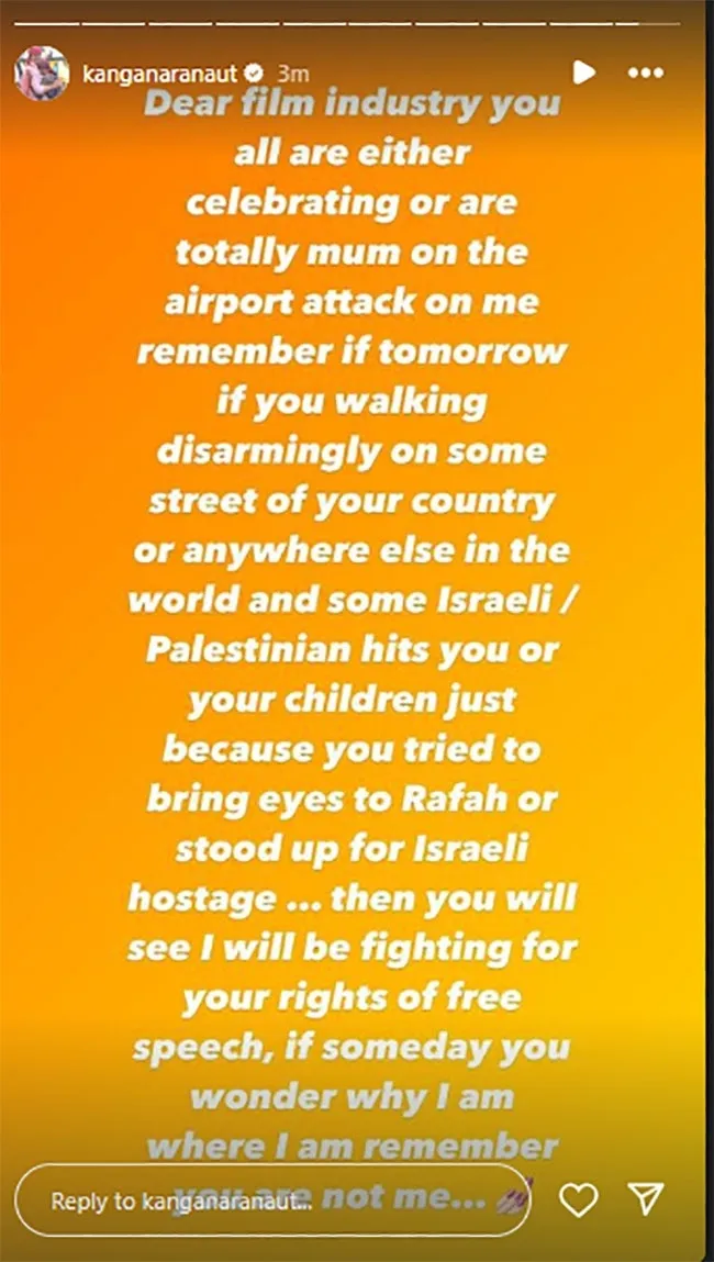 जिस पर कंगना ने अपनी नाराजगी जताई है. उन्होंने इंस्टाग्राम पर स्टोरी पोस्ट कर बॉलीवुड के लोगों को कॉल आउट किया. उन्होंने लिखा कि "प्रिय फिल्म उद्योग आप सभी या तो जश्न मना रहे हैं या मुझ पर हवाई अड्डे पर हुए हमले पर पूरी तरह से चुप हैं.