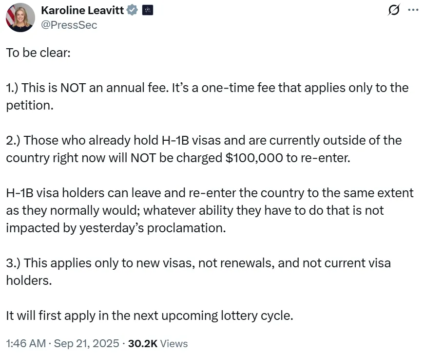 व्हाइट हाउस की प्रेस सेक्रेटरी कैरोलिन लेविट ने स्पष्ट किया है कि H-1B वीजा के लिए 88 लाख रुपये की फीस सालाना नहीं है, बल्कि यह एक बार की फीस है जो सिर्फ आवेदन के समय देनी होगी। यह बदलाव केवल लॉटरी से चुने गए नए वीजा आवेदनों पर लागू होगा।