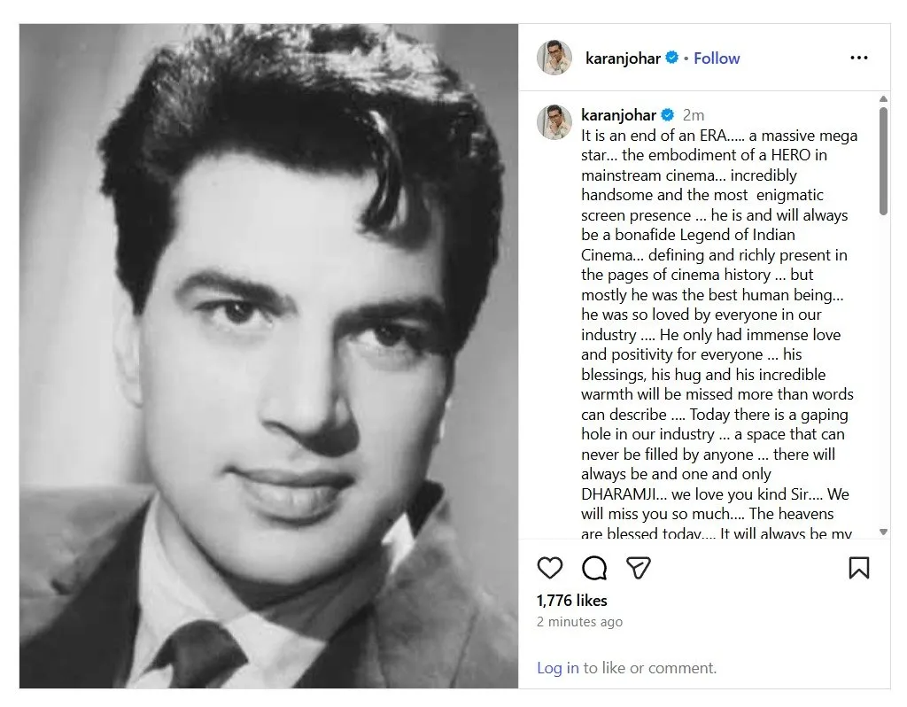 उन्होंने लिखा— "यह एक युग का अंत है… एक विशाल मेगास्टार… मुख्यधारा सिनेमा में हीरो का असली रूप… बेहद हैंडसम, अद्भुत स्क्रीन प्रेज़ेंस… वह भारतीय सिनेमा के सच्चे लीजेंड थे और हमेशा रहेंगे। सिनेमा के इतिहास में उनका नाम हमेशा अमर रहेगा।" करण ने आगे लिखा कि धर्मेंद्र सिर्फ शानदार अभिनेता ही नहीं, बल्कि बेहद अच्छे इंसान भी थे। "हमारी इंडस्ट्री में हर कोई उन्हें दिल से प्यार करता था।" करण जौहर की इस पोस्ट पर फैंस और सेलेब्रिटीज भी भावुक होते दिखाई दे रहे हैं।