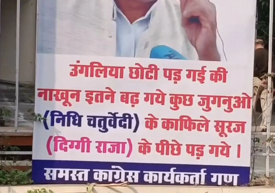 PCC कार्यालय के बाहर लगाए गए पोस्टर में लिखा है 'उंगलियां छोटी पड़ गईं कि नाखून इतने बढ़ गए, कुछ जुगनुओं (निधि चतुर्वेदी) के काफिले सूरज (दिग्गी राजा) के पीछे पड़ गए।' पोस्टर में कोष्ठक के भीतर निधि चतुर्वेदी और दिग्विजय सिंह का नाम लिखे जाने से यह साफ हो गया कि निशाना सीधे कांग्रेस नेता निधि चतुर्वेदी पर ही साधा गया है।
