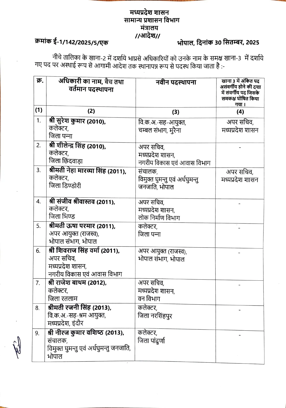 राज्य शासन के आदेश अनुसार छिंदवाड़ा कलेक्टर शीलेंद्र सिंह को अपर सचिव, नगरीय विकास और आवास विभाग (Urban Development & Housing Department) में स्थानांतरित किया गया है। डिंडोरी की कलेक्टर नेहा मारव्या को संचालक, विमुक्त घुमंतू और अर्ध घुमंतु जनजाति विभाग (Director, De-notified and Semi-Nomadic Tribes Department) तैनात किया गया है। वहीं, भिंड के कलेक्टर संजीव श्रीवास्तव को अपर सचिव, लोक निर्माण विभाग (Public Works Department) में भेजा गया है।