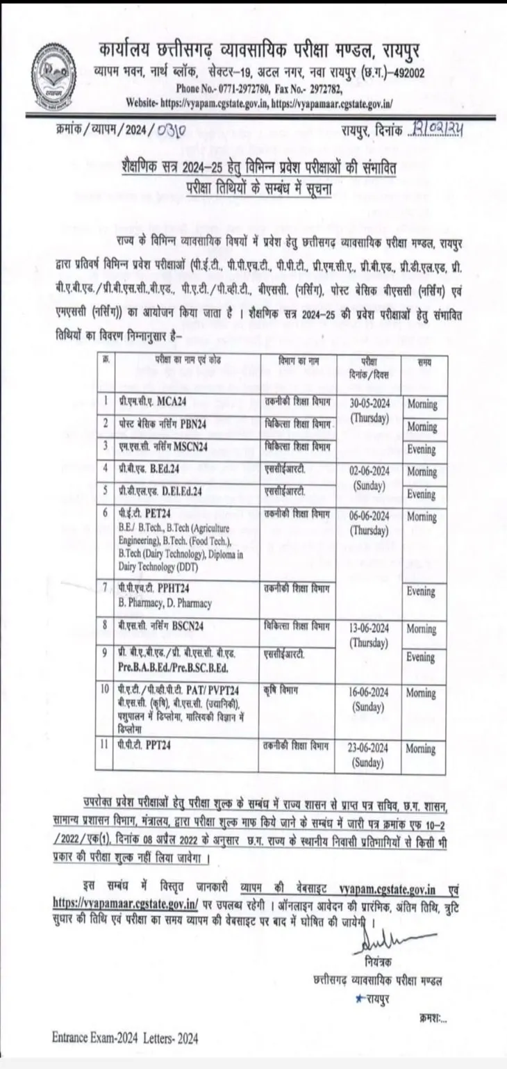 रायपुर। CG News: छत्तीसगढ़ व्यवसायिक परीक्षा मंडल ने 11 अलग-अलग परीक्षाओं के लिए तारीखें घोषित की हैं। प्री-एमसीए और पोस्ट बेसिक नर्सिंग की परीक्षा 30 मई को सुबह की शिफ्ट में होगी और MSC नर्सिंग की परीक्षा भी 30 मई शाम की शिफ्ट में कराई जाएगी।