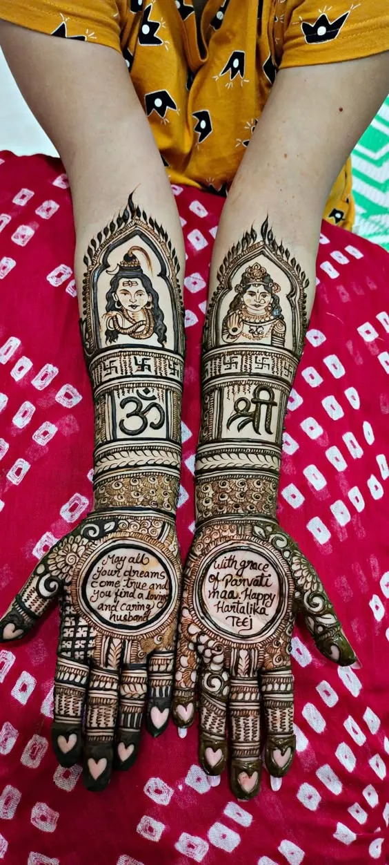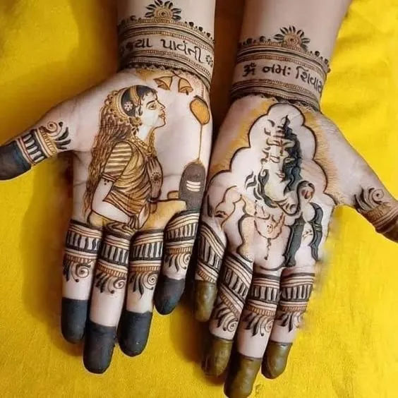अगर आप एक यूनिक मेंहदी डिजाइन लगाना चाहतें हैं तो आप मेंहदी की शुरूआत में या बीच में शिव-पार्वती की तस्वीर बनाकर मेहँदी लगा सकते हैं. इसमें सुंदरता जोड़ने के लिए आप इसमें शिव जी के साथ ॐ और पार्वती जी के साथ श्री भी लगा सकते हैं।